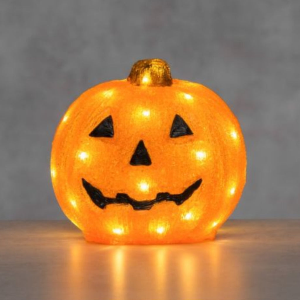 Akryylista valmistettu paristotoiminen Halloween-kurpitsa ei nahistu vuosienkaan käytön jälkeen. Sisältää 30 LED-valoa. Ajastintoiminto 6h on/18h off. Paristot 3 x AA (ei sisälly). Sisä- ja ulkokäyttöön.