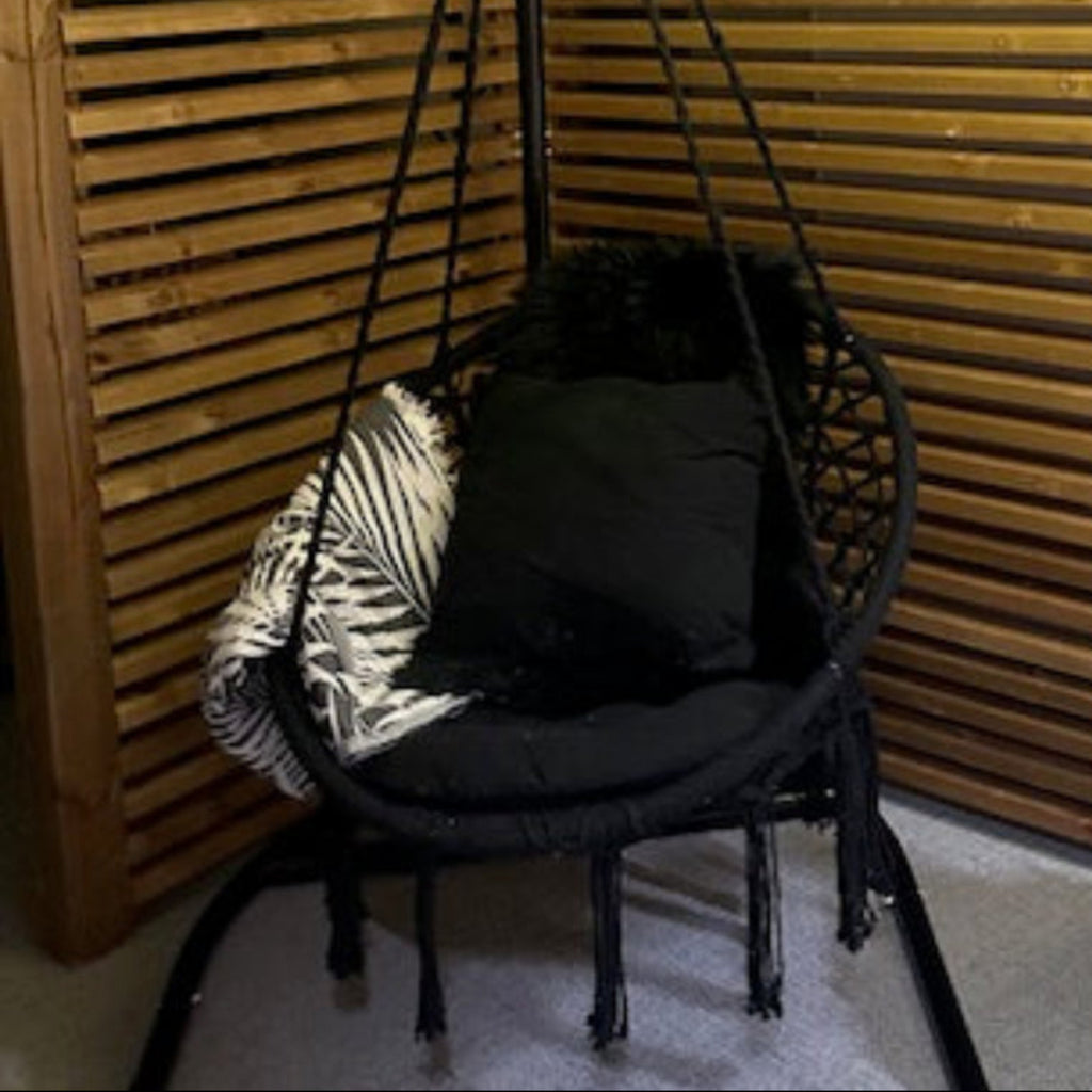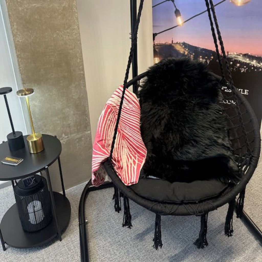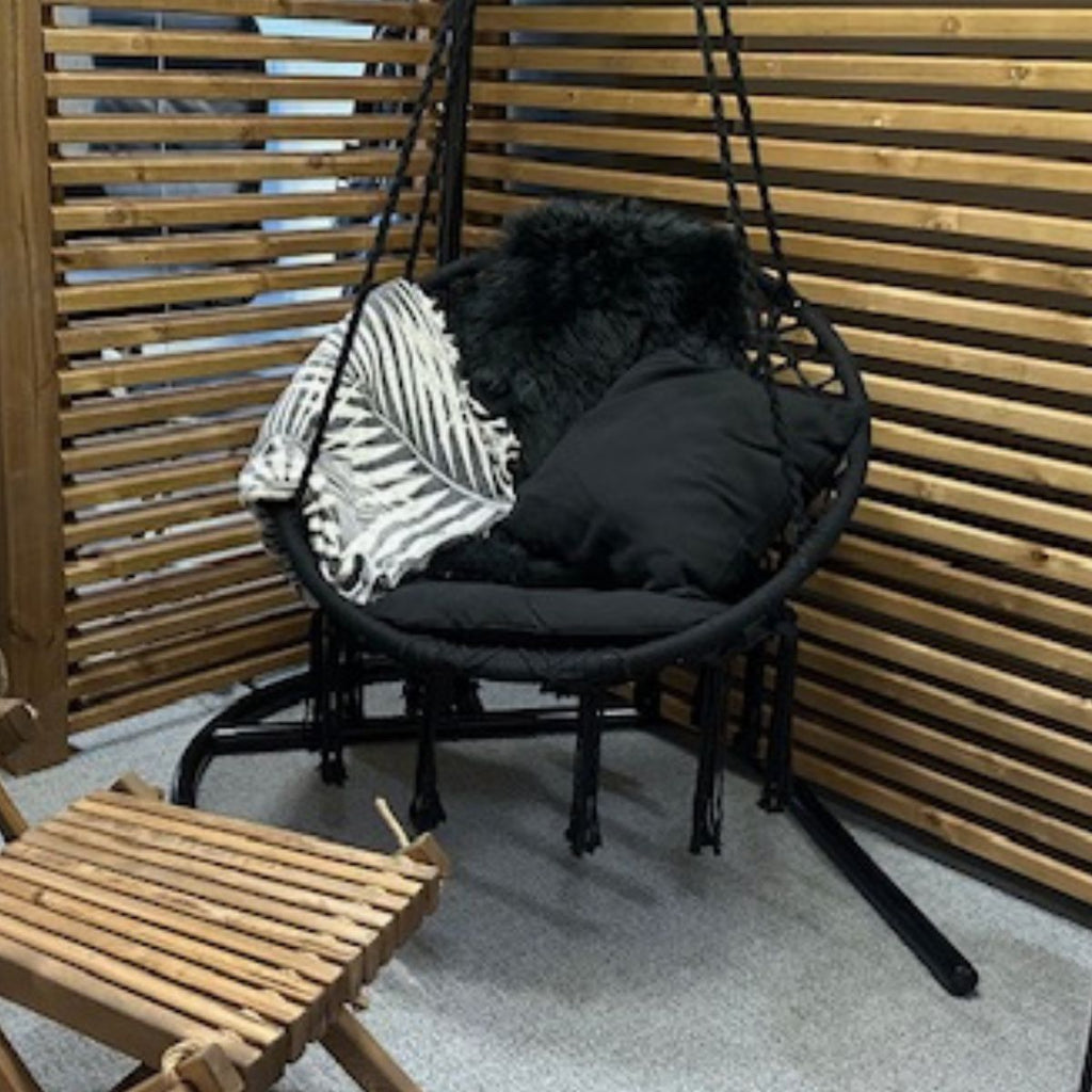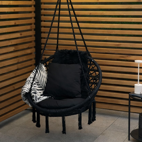 Riipputuolin kauniit letitetyt kiinnitysköydet ja ilmava rakenne tekevät siitä paitsi näyttävän sisustuselementin, myös ihanan paikan rentoutumiseen. Valittavanasi on kaksi klassista väriä: syvä musta tai raikas valkoinen – molemmat sopivat loistavasti niin modernille kuin rustiikkiselle terassille.