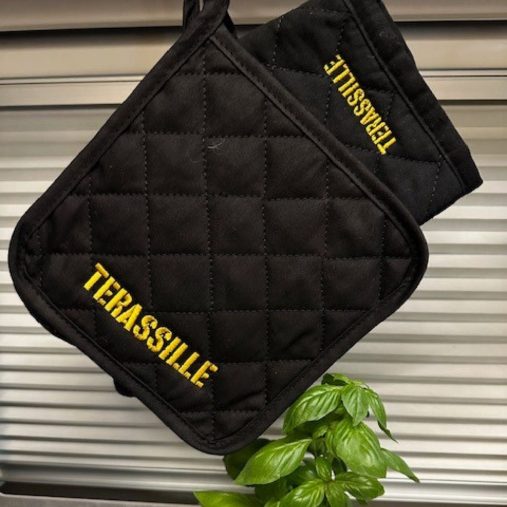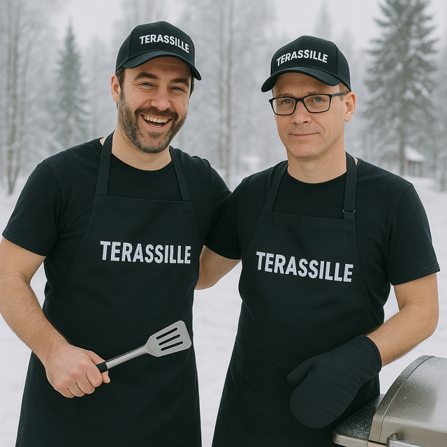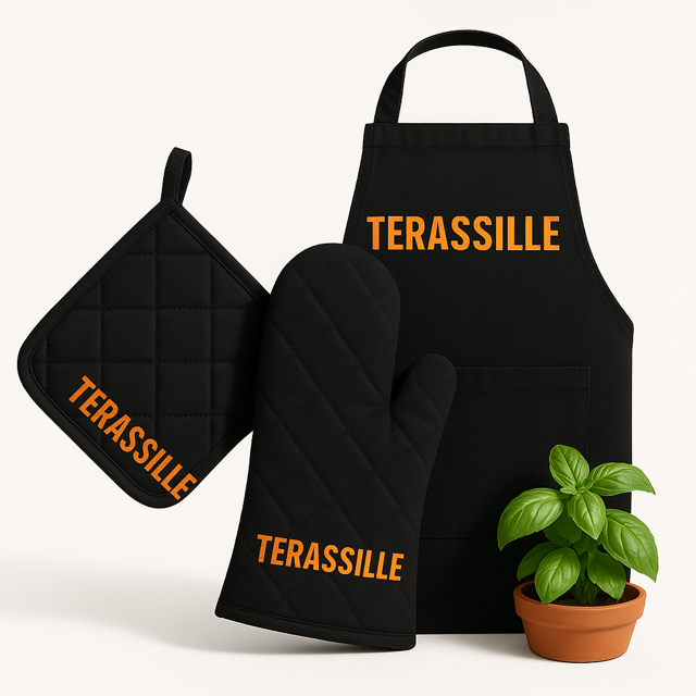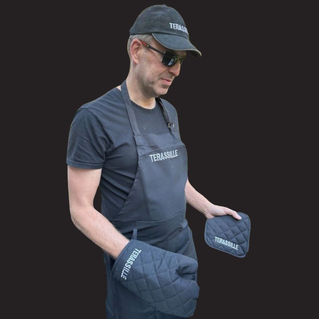 Terassille.comin grillaajan setti pitää tyylin ja turvallisuuden kohdillaan. Mukana käytännöllinen essu, kuumuutta kestävä patakinnas ja patalappu – kaikki Terassille-brändin hengessä.
